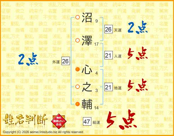 沼(9画)澤(17画) 心(4画)之(3画)輔(14画)