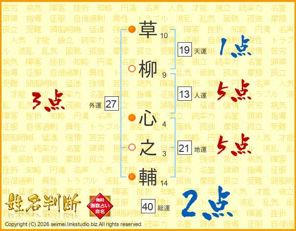 草(10画)柳(9画) 心(4画)之(3画)輔(14画)