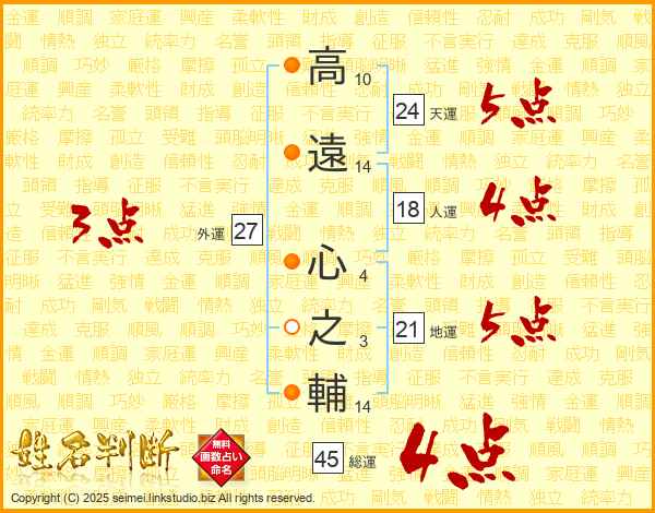 高(10画)遠(14画) 心(4画)之(3画)輔(14画)