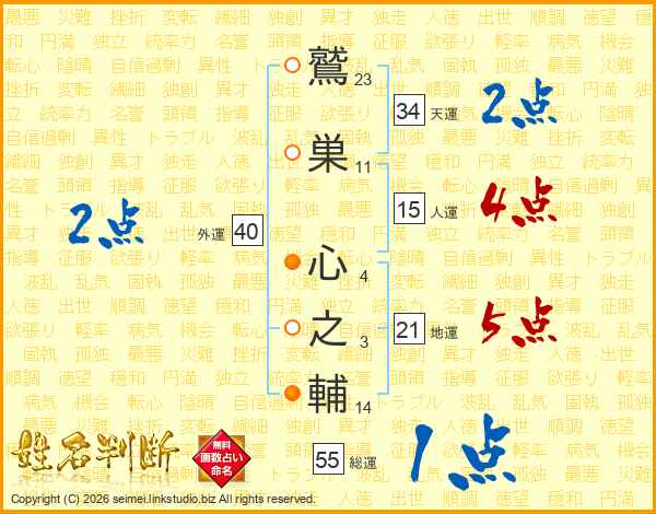 鷲(23画)巣(11画) 心(4画)之(3画)輔(14画)