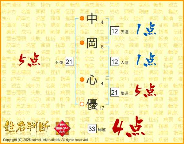 中(4画)岡(8画) 心(4画)優(17画)