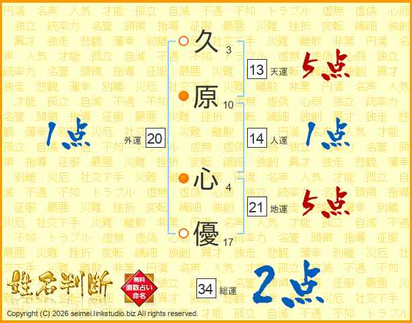 久(3画)原(10画) 心(4画)優(17画)
