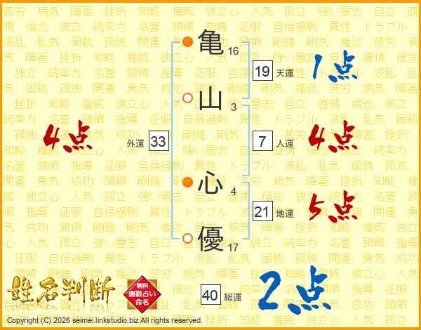 生活面を象徴する運勢です。外部から受ける影響力を表し、結婚運、家庭運や職場、環境への順応性を表します。総運から人運を引いた画数。姓や名が1文字の場合を除く。