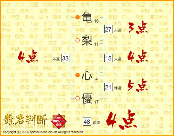 生活面を象徴する運勢です。外部から受ける影響力を表し、結婚運、家庭運や職場、環境への順応性を表します。総運から人運を引いた画数。姓や名が1文字の場合を除く。