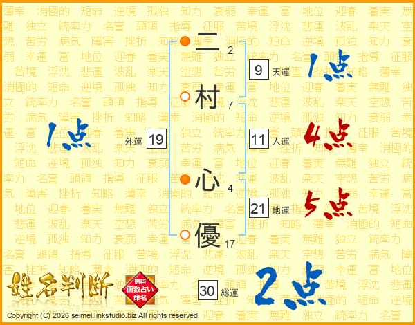 二村心優さんの人運は11画の4点!