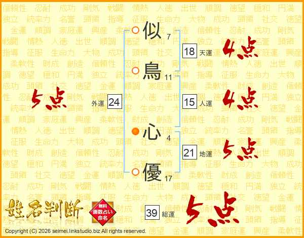 似鳥心優さんの総運は39画の5点!