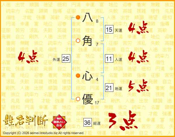 八(8画)角(7画) 心(4画)優(17画)