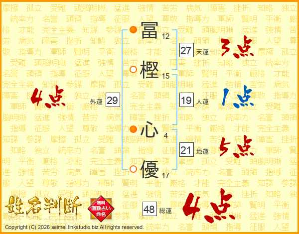 あなたの人生を表す1番重要な運勢です。生涯を通じて影響する総合運となり、主に50歳以降の晩年期に影響を及ぼします。苗字と名前の合計画数。