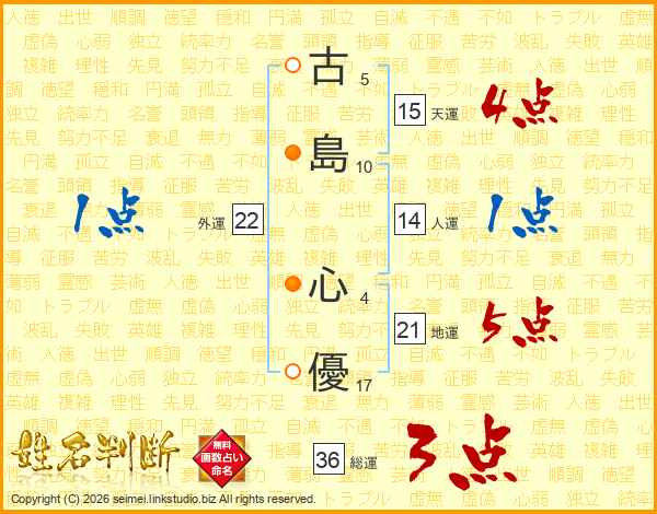 生活面を象徴する運勢です。外部から受ける影響力を表し、結婚運、家庭運や職場、環境への順応性を表します。総運から人運を引いた画数。姓や名が1文字の場合を除く。