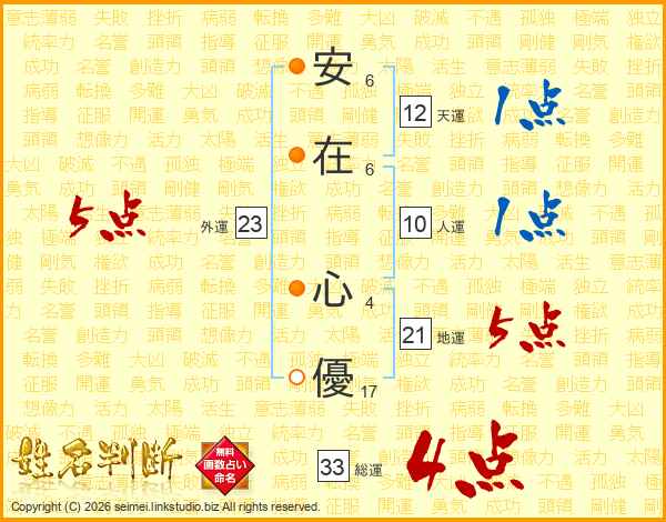 生活面を象徴する運勢です。外部から受ける影響力を表し、結婚運、家庭運や職場、環境への順応性を表します。総運から人運を引いた画数。姓や名が1文字の場合を除く。