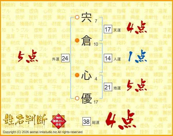 宍倉心優さんの総運は38画の4点!