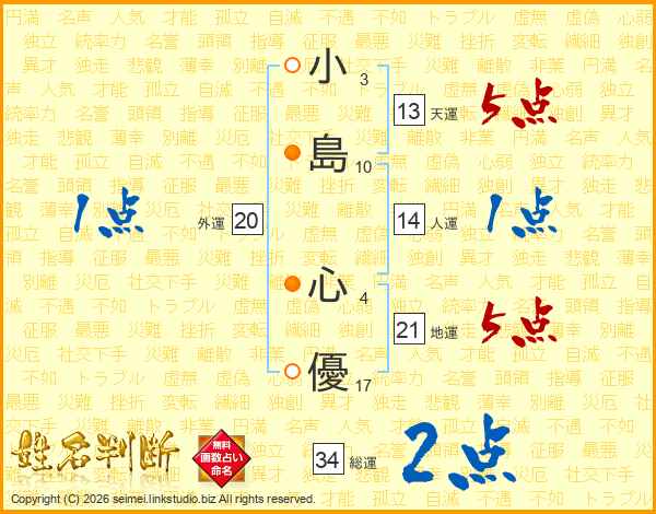 小(3画)島(10画) 心(4画)優(17画)