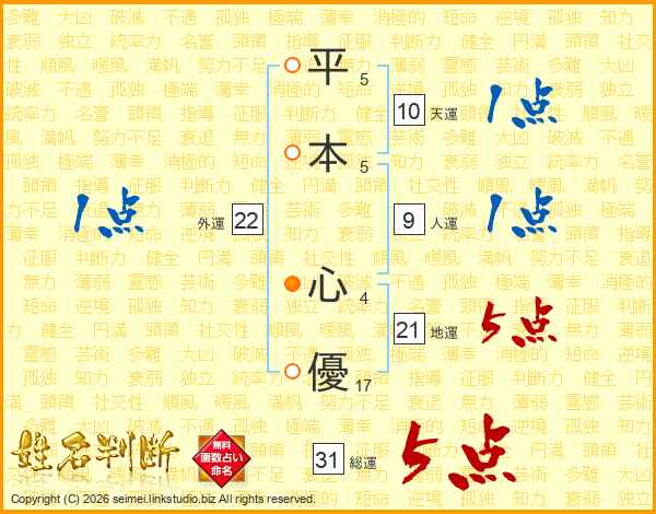 平(5画)本(5画) 心(4画)優(17画)