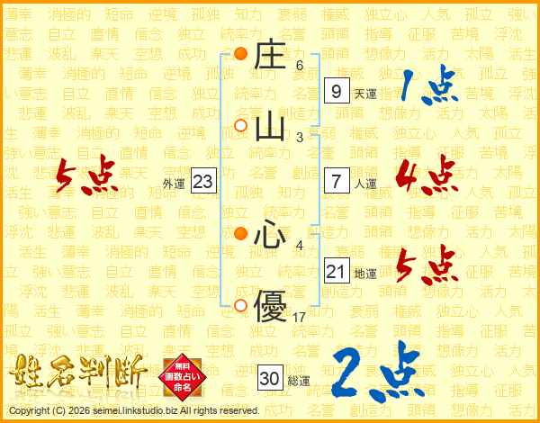 庄(6画)山(3画) 心(4画)優(17画)