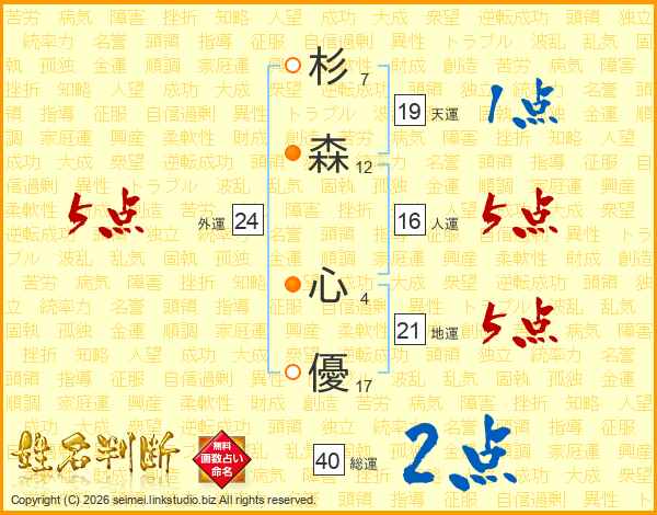 生活面を象徴する運勢です。外部から受ける影響力を表し、結婚運、家庭運や職場、環境への順応性を表します。総運から人運を引いた画数。姓や名が1文字の場合を除く。