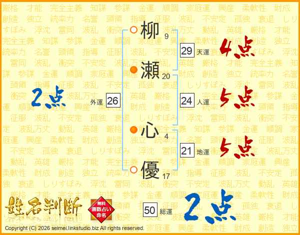 柳(9画)瀬(20画) 心(4画)優(17画)
