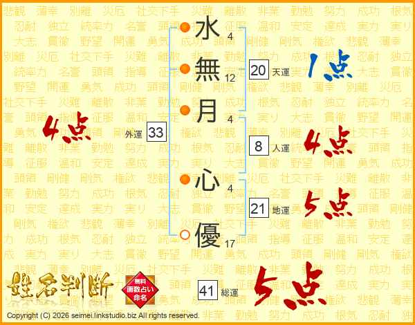 水無月心優さんの総運は41画の5点!
