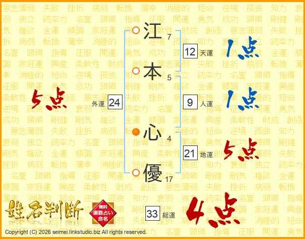 江(7画)本(5画) 心(4画)優(17画)