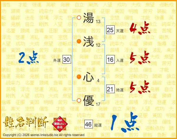 湯(13画)浅(12画) 心(4画)優(17画)