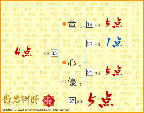 竜(16画) 心(4画)優(17画)