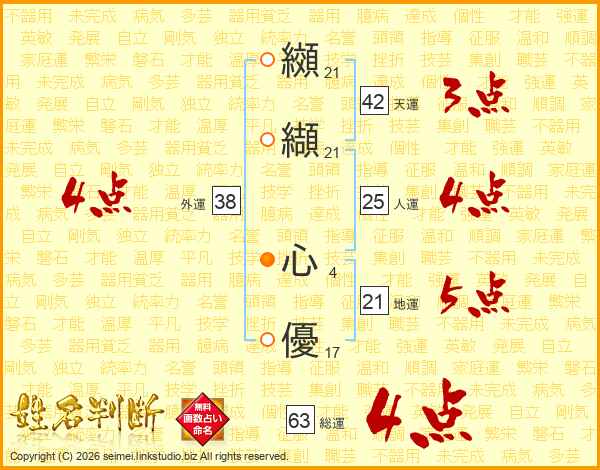 生活面を象徴する運勢です。外部から受ける影響力を表し、結婚運、家庭運や職場、環境への順応性を表します。総運から人運を引いた画数。姓や名が1文字の場合を除く。