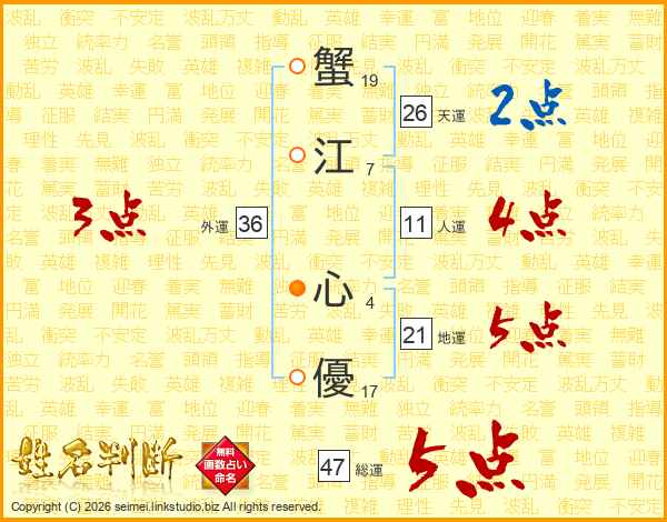 生活面を象徴する運勢です。外部から受ける影響力を表し、結婚運、家庭運や職場、環境への順応性を表します。総運から人運を引いた画数。姓や名が1文字の場合を除く。
