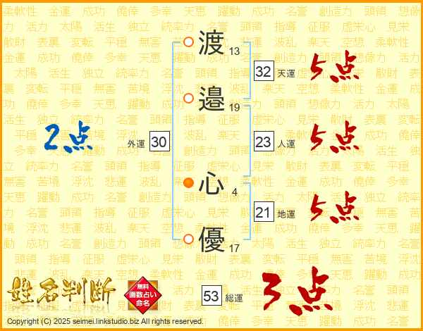 生活面を象徴する運勢です。外部から受ける影響力を表し、結婚運、家庭運や職場、環境への順応性を表します。総運から人運を引いた画数。姓や名が1文字の場合を除く。