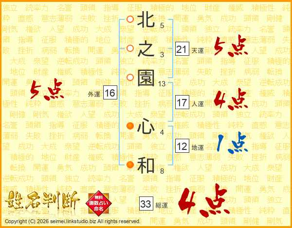 北(5画)之(3画)園(13画) 心(4画)和(8画)