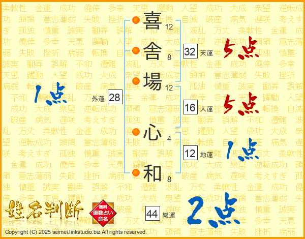 喜(12画)舎(8画)場(12画) 心(4画)和(8画)