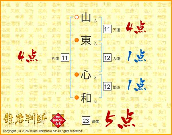 生活面を象徴する運勢です。外部から受ける影響力を表し、結婚運、家庭運や職場、環境への順応性を表します。総運から人運を引いた画数。姓や名が1文字の場合を除く。