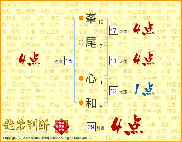 生活面を象徴する運勢です。外部から受ける影響力を表し、結婚運、家庭運や職場、環境への順応性を表します。総運から人運を引いた画数。姓や名が1文字の場合を除く。