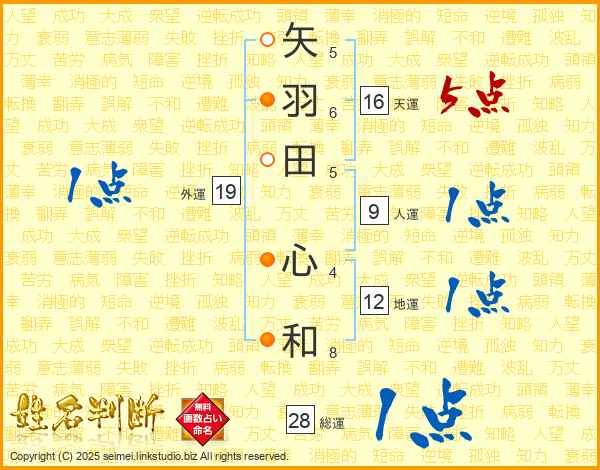 矢(5画)羽(6画)田(5画) 心(4画)和(8画)