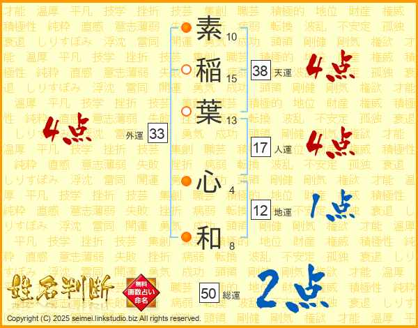 素(10画)稲(15画)葉(13画) 心(4画)和(8画)