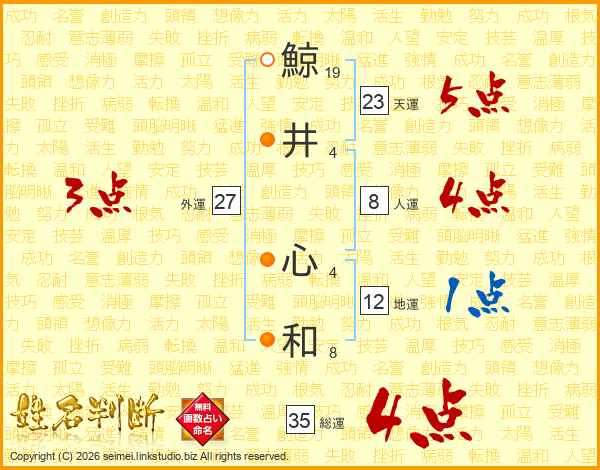 鯨(19画)井(4画) 心(4画)和(8画)