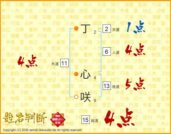 生活面を象徴する運勢です。外部から受ける影響力を表し、結婚運、家庭運や職場、環境への順応性を表します。総運から人運を引いた画数。姓や名が1文字の場合を除く。