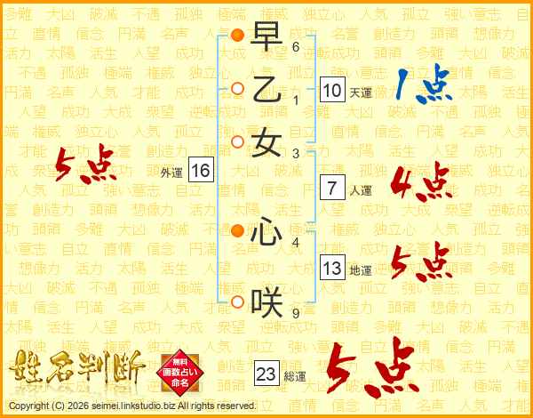 早(6画)乙(1画)女(3画) 心(4画)咲(9画)