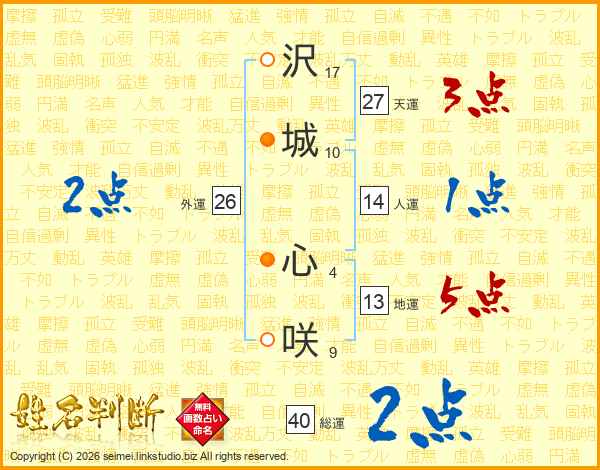 沢(17画)城(10画) 心(4画)咲(9画)