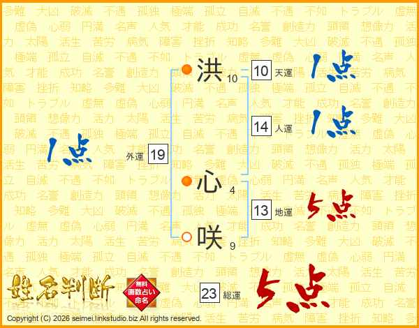 生活面を象徴する運勢です。外部から受ける影響力を表し、結婚運、家庭運や職場、環境への順応性を表します。総運から人運を引いた画数。姓や名が1文字の場合を除く。