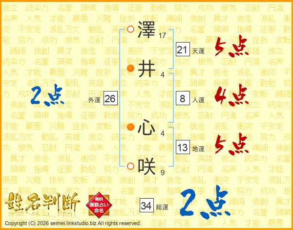 生活面を象徴する運勢です。外部から受ける影響力を表し、結婚運、家庭運や職場、環境への順応性を表します。総運から人運を引いた画数。姓や名が1文字の場合を除く。