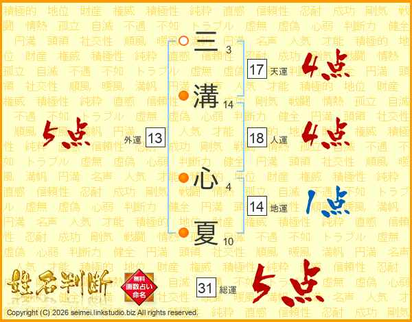 生活面を象徴する運勢です。外部から受ける影響力を表し、結婚運、家庭運や職場、環境への順応性を表します。総運から人運を引いた画数。姓や名が1文字の場合を除く。