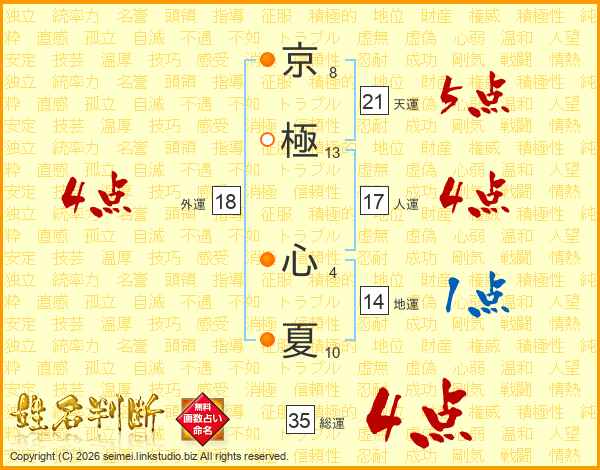 生活面を象徴する運勢です。外部から受ける影響力を表し、結婚運、家庭運や職場、環境への順応性を表します。総運から人運を引いた画数。姓や名が1文字の場合を除く。