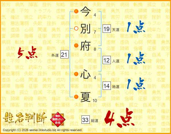 今(4画)別(7画)府(8画) 心(4画)夏(10画)