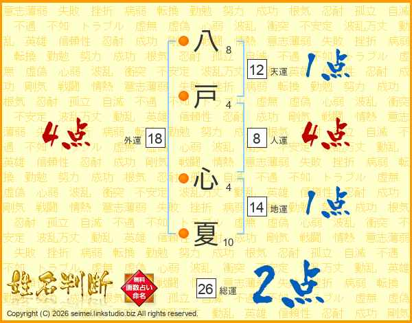 生活面を象徴する運勢です。外部から受ける影響力を表し、結婚運、家庭運や職場、環境への順応性を表します。総運から人運を引いた画数。姓や名が1文字の場合を除く。