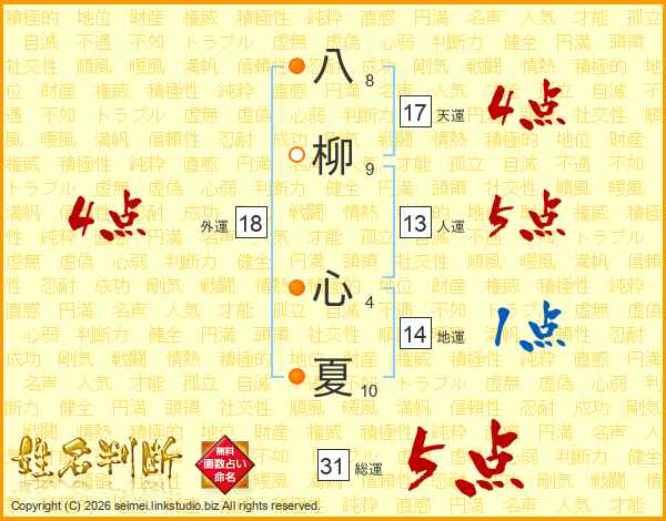 生活面を象徴する運勢です。外部から受ける影響力を表し、結婚運、家庭運や職場、環境への順応性を表します。総運から人運を引いた画数。姓や名が1文字の場合を除く。