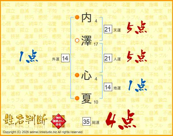 生活面を象徴する運勢です。外部から受ける影響力を表し、結婚運、家庭運や職場、環境への順応性を表します。総運から人運を引いた画数。姓や名が1文字の場合を除く。