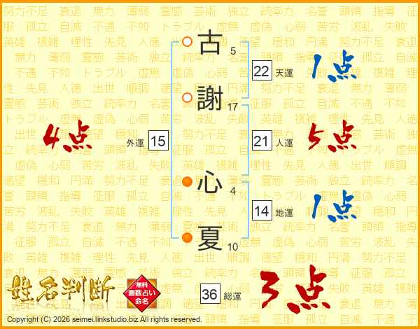 生活面を象徴する運勢です。外部から受ける影響力を表し、結婚運、家庭運や職場、環境への順応性を表します。総運から人運を引いた画数。姓や名が1文字の場合を除く。