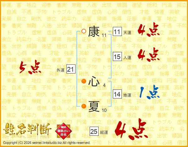 生活面を象徴する運勢です。外部から受ける影響力を表し、結婚運、家庭運や職場、環境への順応性を表します。総運から人運を引いた画数。姓や名が1文字の場合を除く。