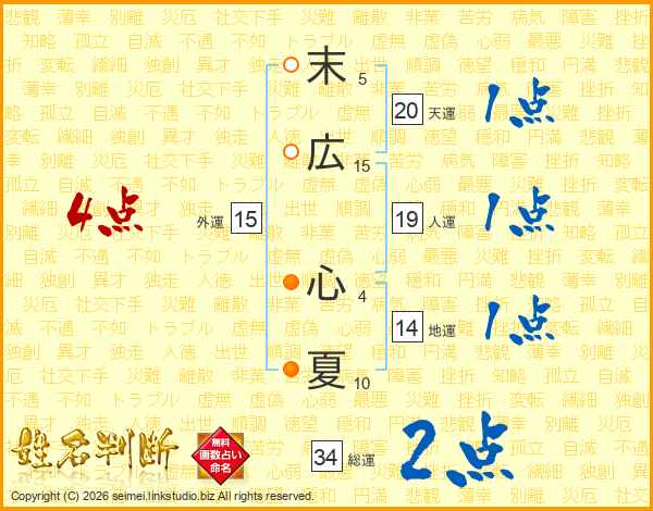 生活面を象徴する運勢です。外部から受ける影響力を表し、結婚運、家庭運や職場、環境への順応性を表します。総運から人運を引いた画数。姓や名が1文字の場合を除く。