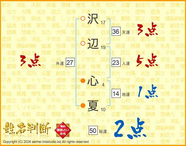 沢(17画)辺(19画) 心(4画)夏(10画)