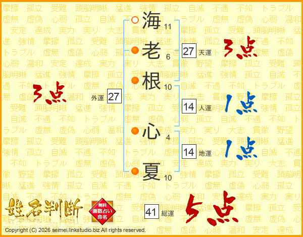海(11画)老(6画)根(10画) 心(4画)夏(10画)